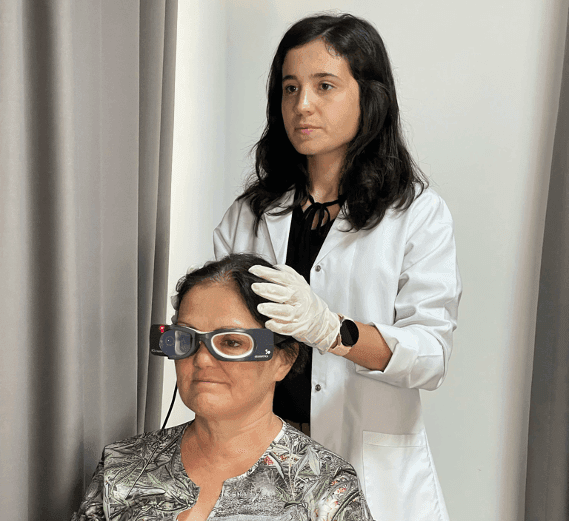 To evaluate eye movements more precisely, the test may be conducted in a dark room with a light directed at the eyes or recorded using special video goggles (Videonystagmography – VNG).