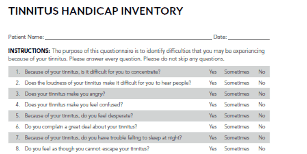 Evaluates the impact of tinnitus on a patient’s quality of life through a questionnaire assessing social, emotional, and functional effects.